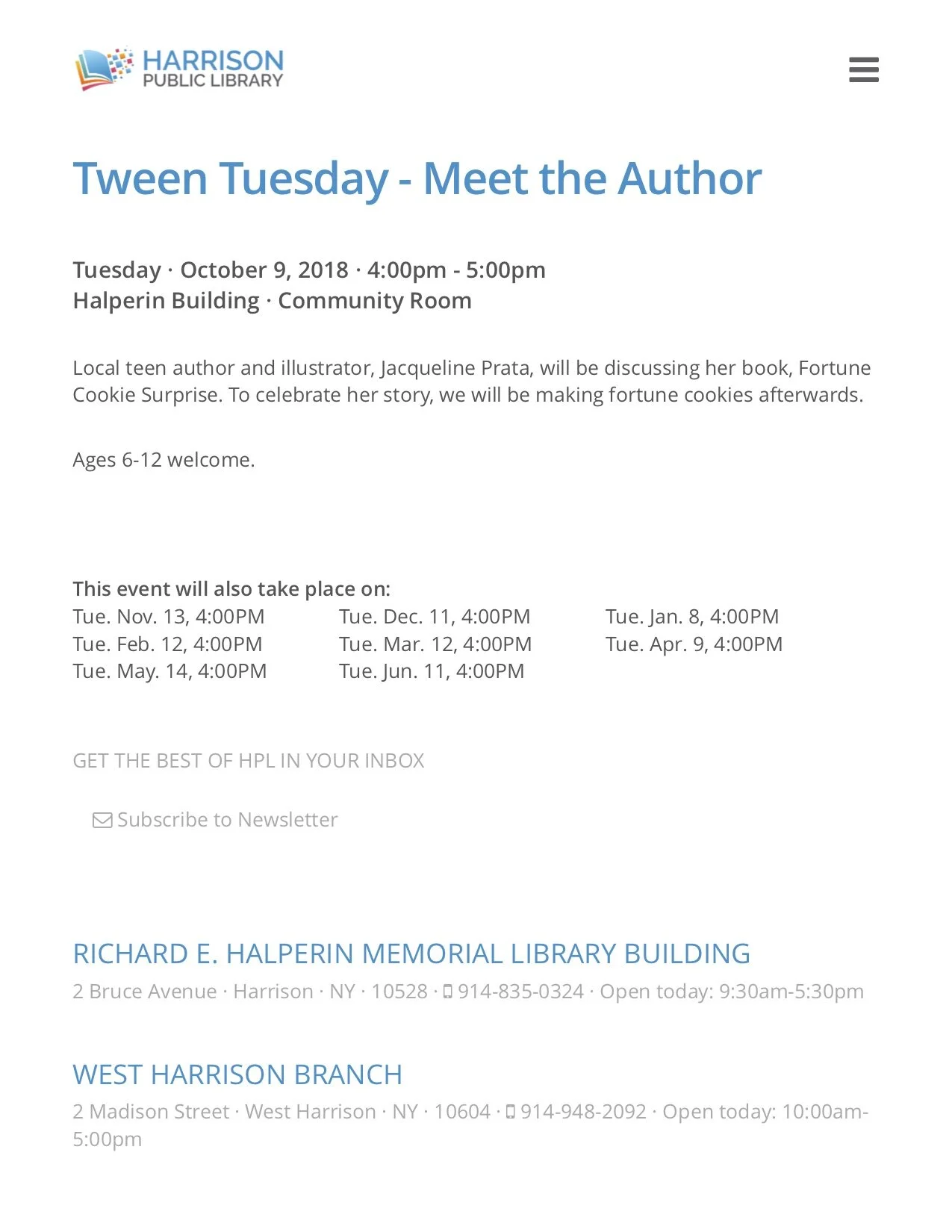 On October 9th, Jackie was an invited guess speaker at Harrison Library. She read Fortune Cookie Surprise! and answered questions from over 20 children and their parents about the book creation and publishing process.