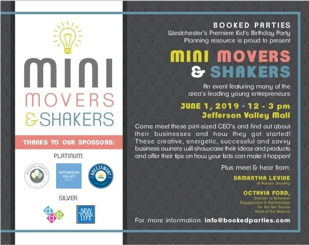 On June 1st, Jackie was featured in Booked Parties’ Mini Movers and Shakers Showcase featuring young entrepreneurs. This event allowed for the sharing of innovative ideas and for visitors to learn about young emerging businesses and how they got started. Thank you to to Meryl Lefkowitz and Claire Gilvar of Booked Parties, and special guests and sponsors - Sam Levine, founder of Auburn Jewlerers, Octavia Ford, VP of Partnerships at Girls Scouts of America, Gary Wawrycki, from Wells Fargo and Deputy County Executive Ken Jenkins for all the support and encouragement!